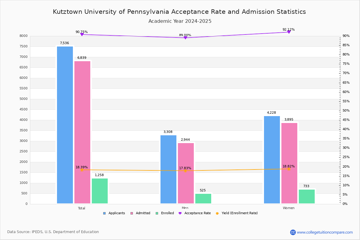Kutztown university of pennsylvania has an acceptance rate of 96%. A total of 7,248 students (3,281 men and 3,967 women) have applied to and 6,968 (3,132 men and 3,836 women).